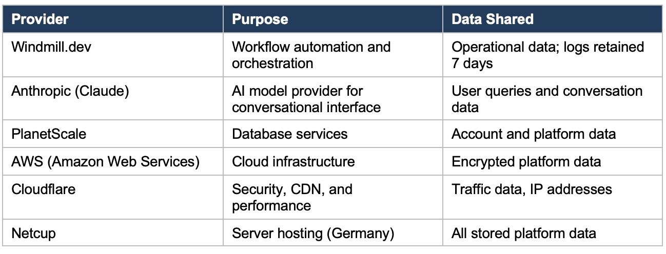 We engage trusted third-party companies and individuals to perform services on our behalf. These providers have access to your personal data only to the extent necessary to perform their functions and are contractually obligated to protect your data. Our key service providers include: